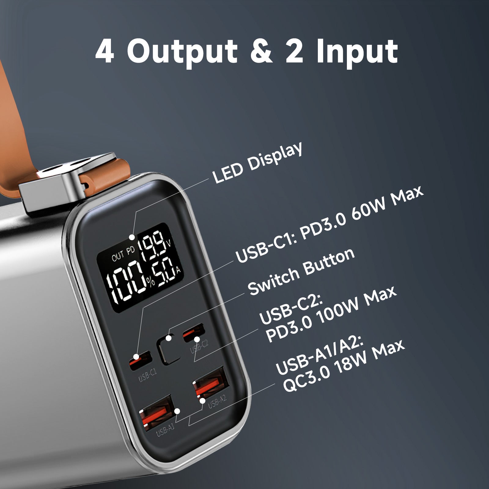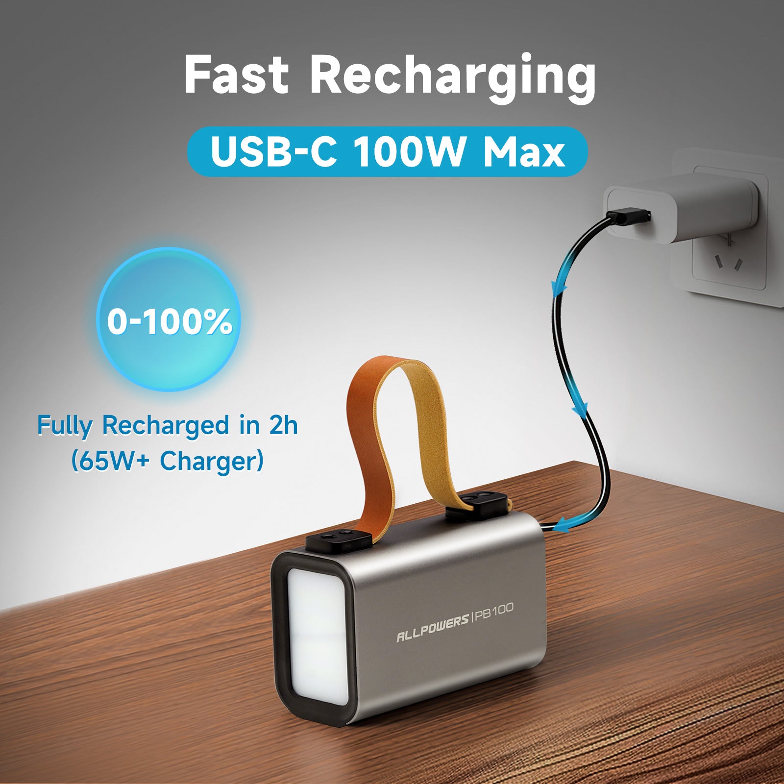 Il power bank per laptop ALLPOWERS supporta il protocollo PD3.0 e fornisce fino a 100W di potenza in uscita attraverso la porta USB-C, consentendo di caricare rapidamente laptop, tablet, telefoni cellulari e altri dispositivi. Supporta inoltre una potenza di ingresso fino a 100 W e può essere caricato completamente in 2 ore (utilizzando caricatori da oltre 65 W). Questo potente caricatore può alimentare 4 dispositivi contemporaneamente (max. 5V 4,5A).
