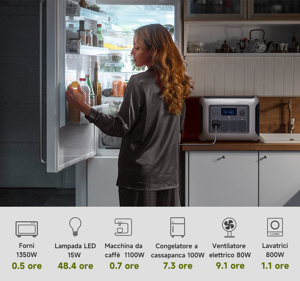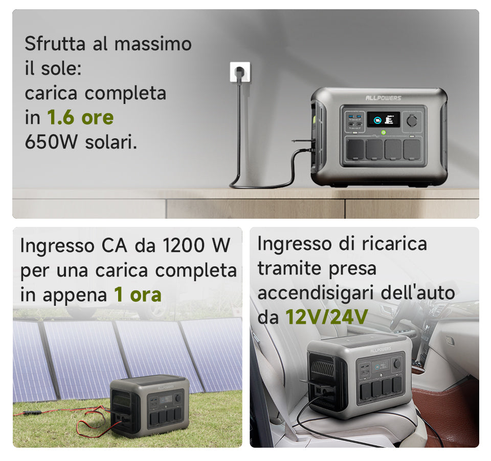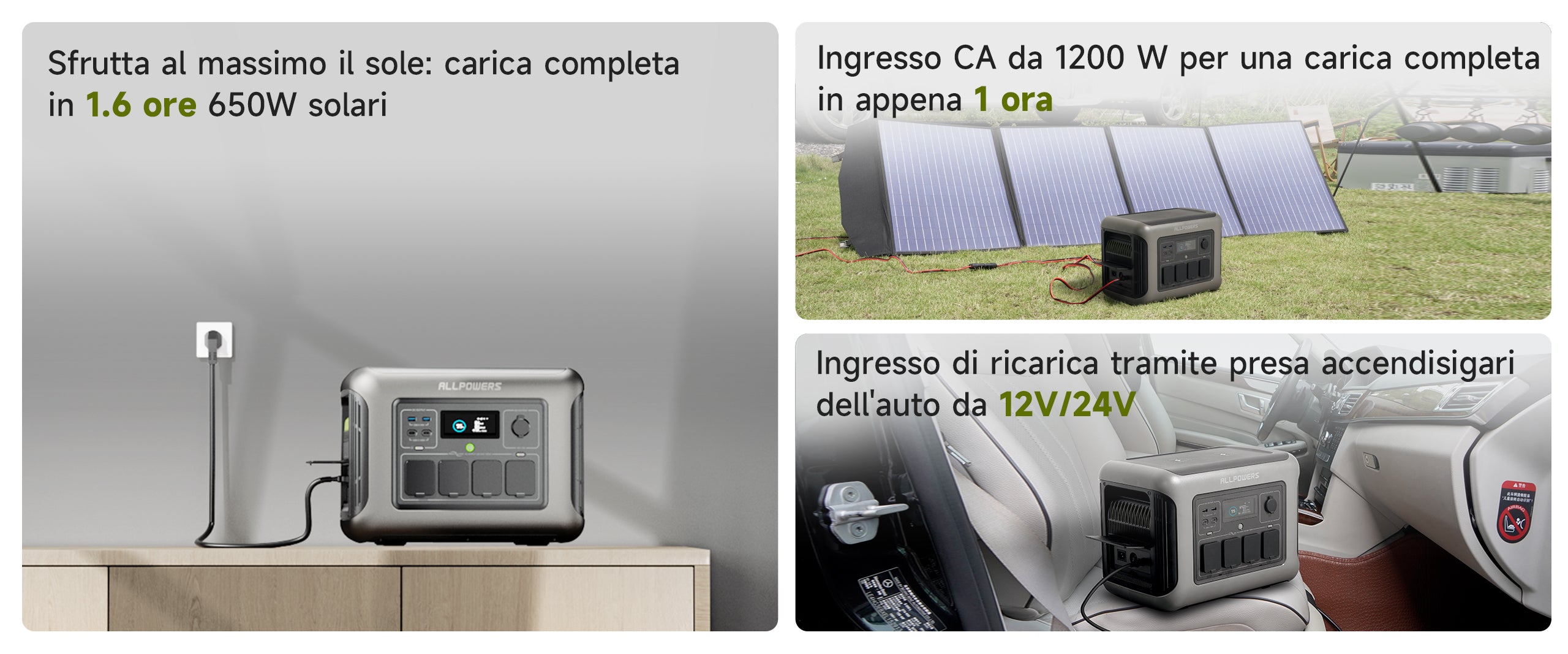 si ricarica completamente da 0 a 100% in soli 60 minuti (ingresso massimo 1200W) con la presa di corrente;quattro modi per caricare il tuo R1500: ricarica CA, ricarica per auto, ricarica solare, doppia ricarica (CA+solare)