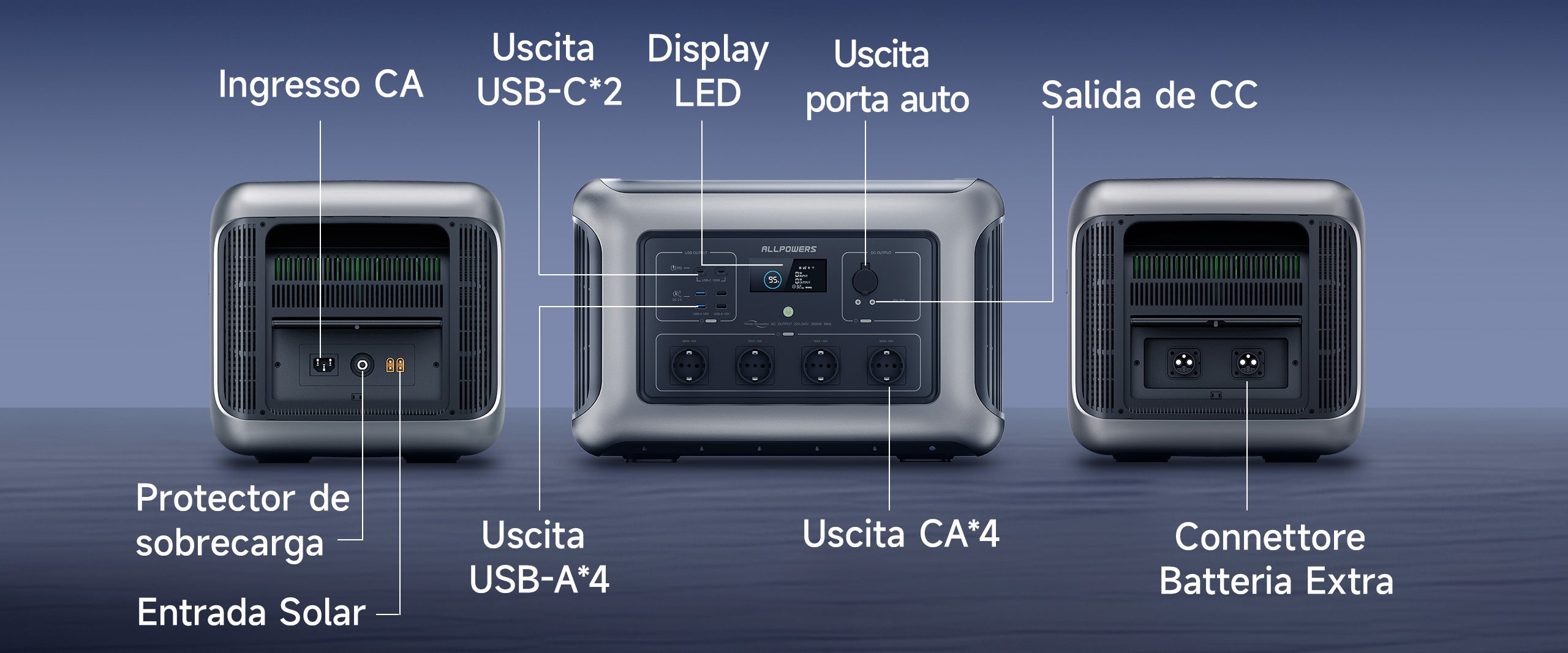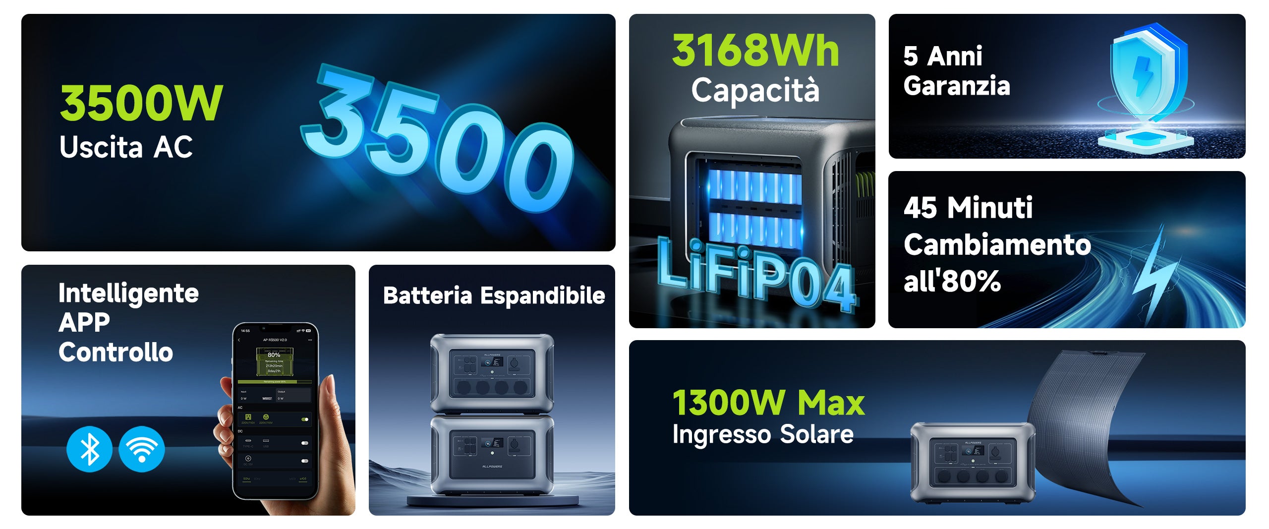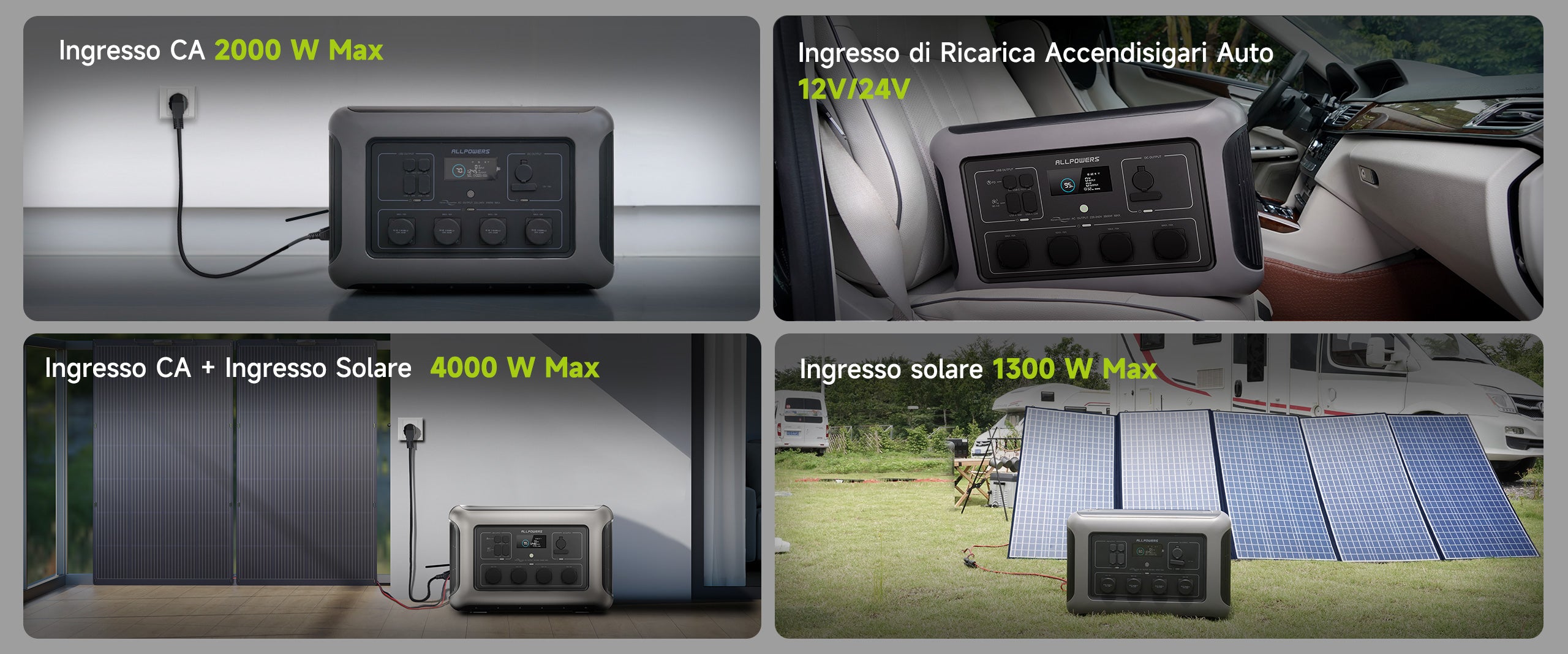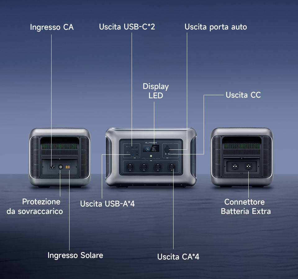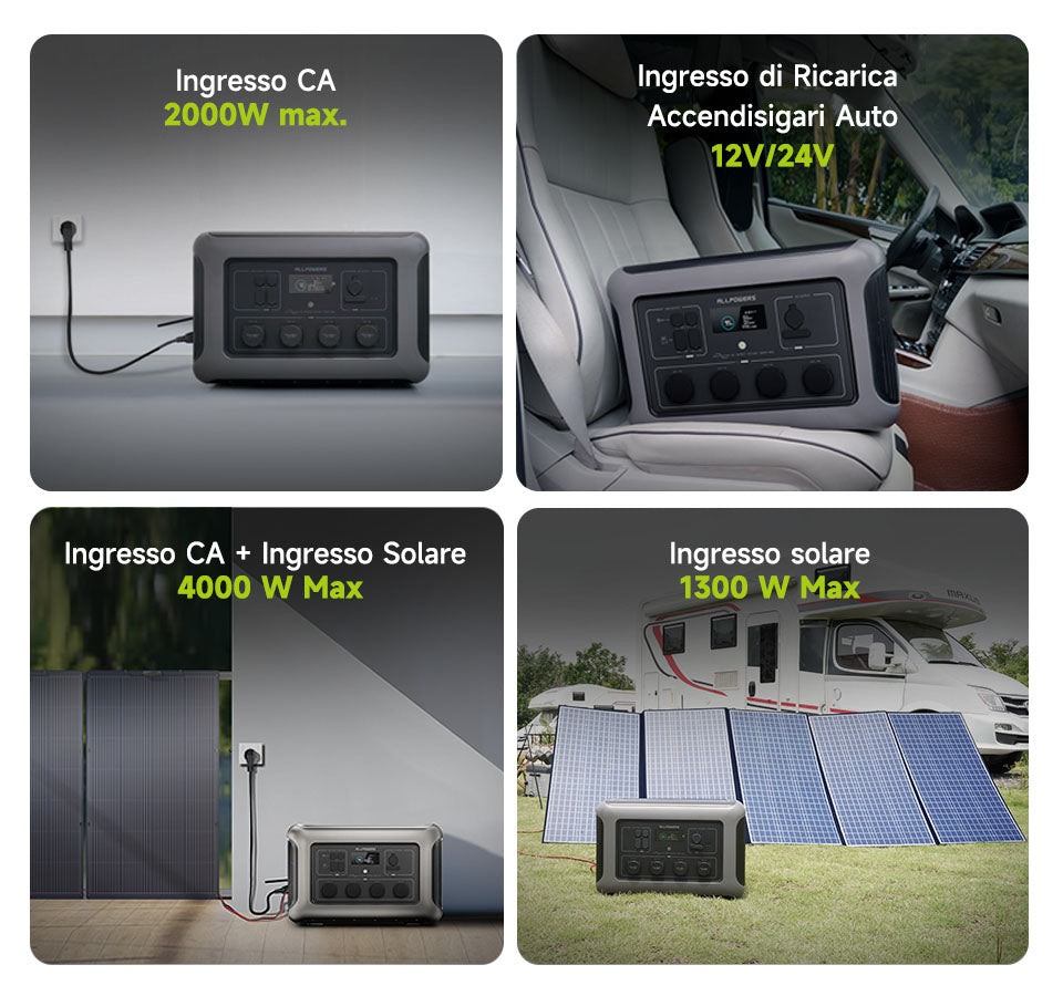 - 4 modalità di ricarica (CA/solare/auto/generatore/doppia CA+solare);