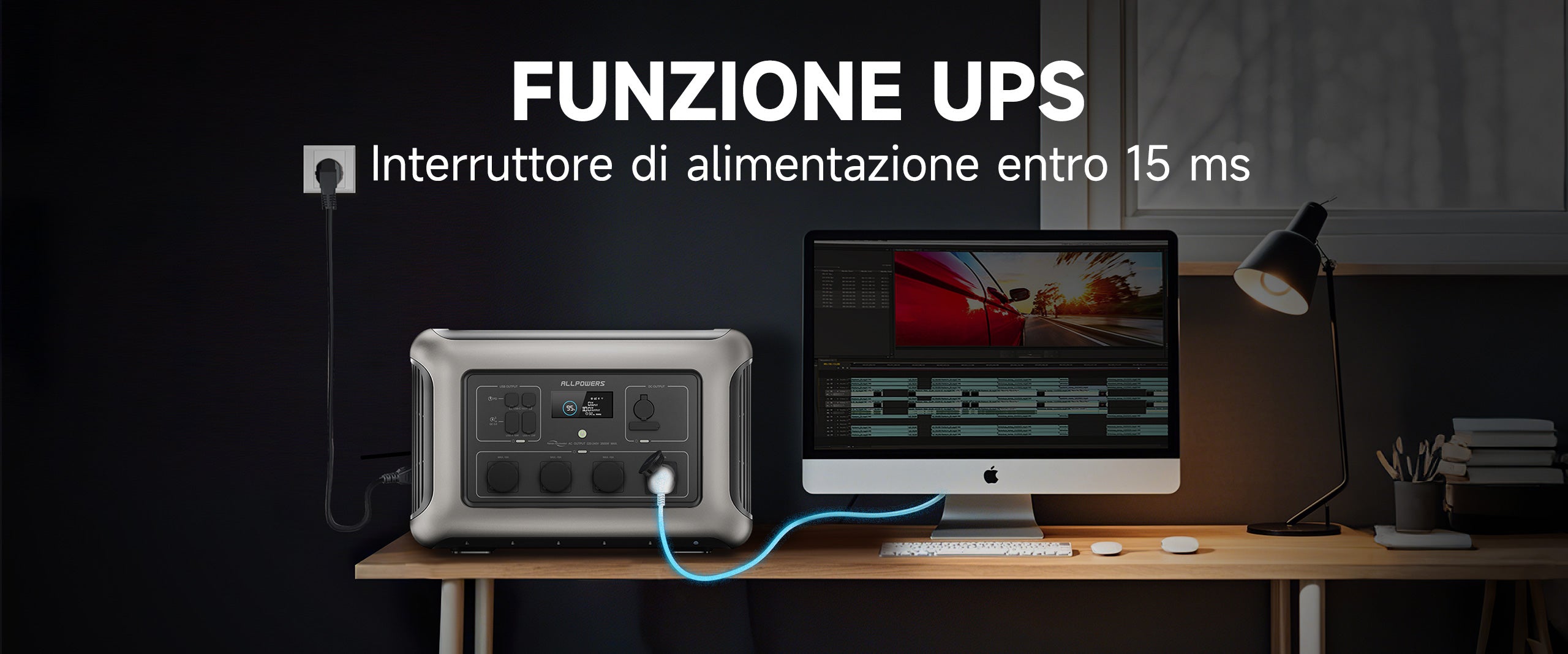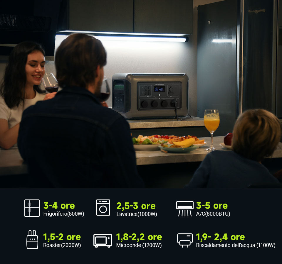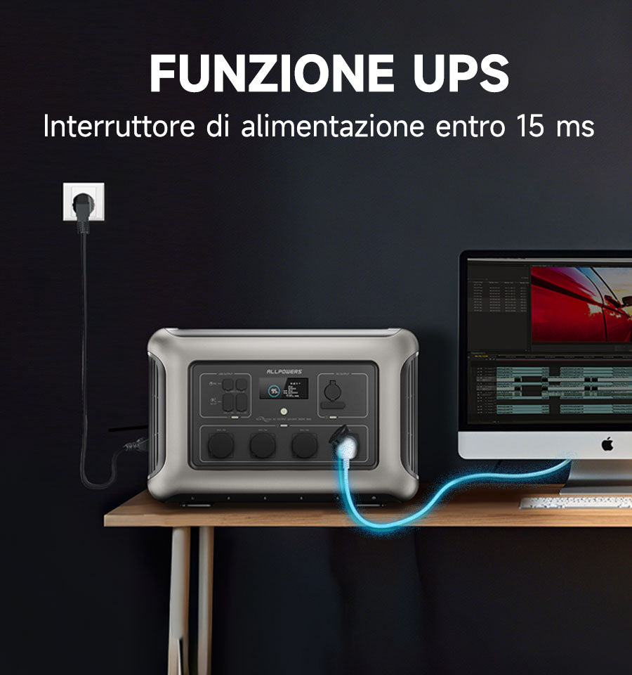 L'alimentatore portatile ALLPOWERS R3500 è dotato di UPS (gruppo di continuità). Dopo aver attivato la funzione UPS, anche in caso di improvvisa interruzione di corrente, i prodotti elettrici collegati non si fermeranno e potranno essere utilizzati così come sono. C'è un momentaneo interruzione durante la commutazione, ma solo 15 ms se la commutazione richiede più tempo. Poiché la corrente di una normale presa di corrente CA domestica è 15 A, la potenza massima in uscita è 1500 W quando si utilizza la modalità UPS.