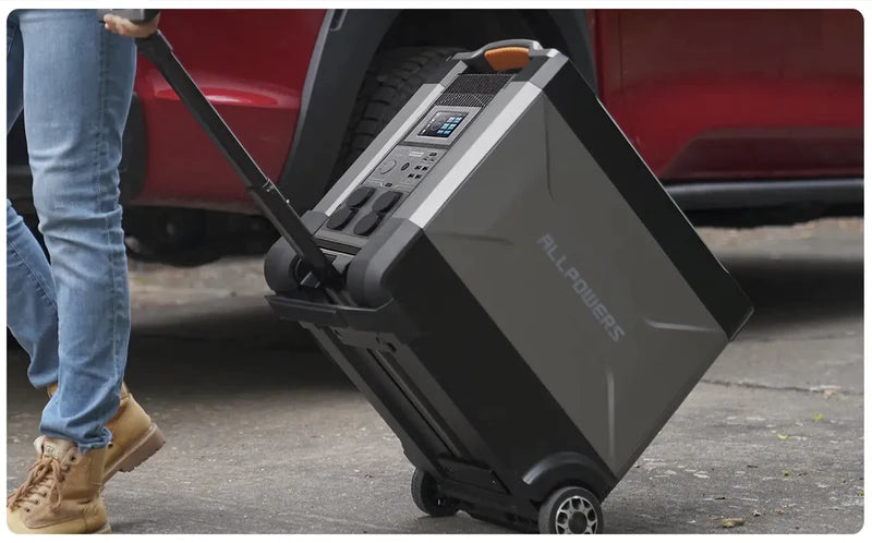 ALLPOWERS R4000 è una batteria ad alta capacità con una batteria al litio ferro fosfato, quindi potresti preoccuparti che sarà difficile da spostare, ma non preoccuparti. Portable Power R4000 è dotato di robuste rotelle simili a custodie da viaggio, quindi anche le donne possono spostalo facilmente, nonostante il suo peso di 45 kg. Ha un profilo sottile per riporlo facilmente e un design resistente che può trasportare carichi fino a 45 kg sulla parte superiore. ALLPOWERS R4000 svolge il ruolo di una batteria portatile per uso domestico, ma è utile anche per campeggiare e dormire in macchina.