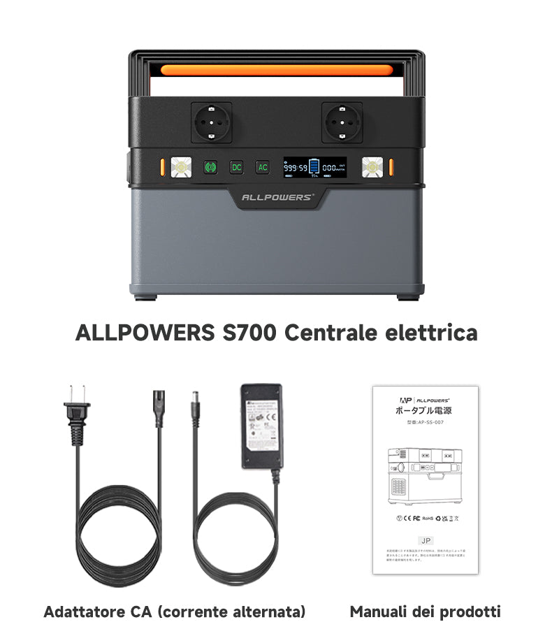 Tieni presente che la porta di uscita CA può caricare/alimentare solo dispositivi che funzionano a meno di 700 Watt. Una volta superato, l'S700 si spegnerà automaticamente. Si prega di fare riferimento alle specifiche del dispositivo prima dell'acquisto.