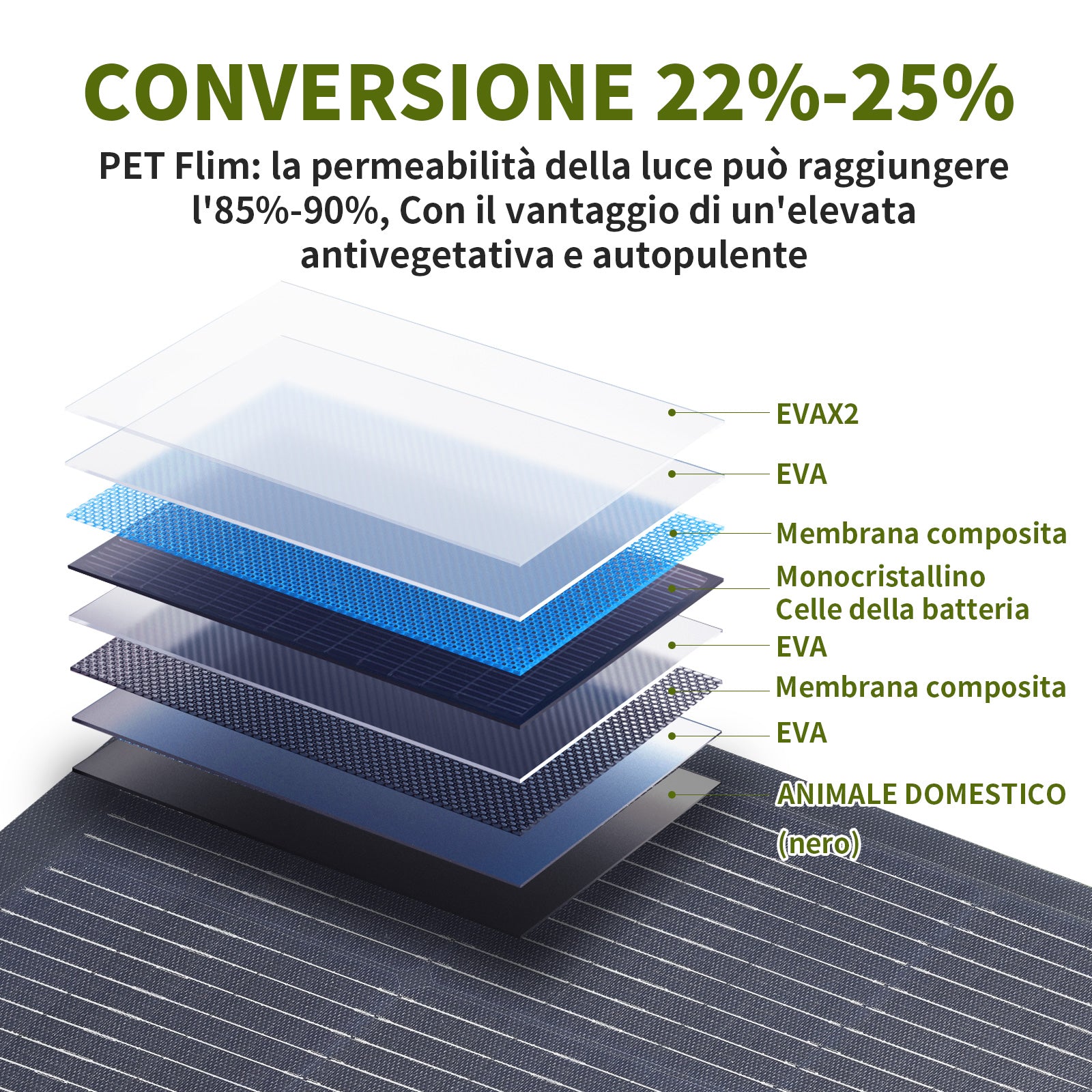 I pannelli solari flessibili ALLPOWERS SF100 sono realizzati con celle solari monocristalline, il cui tasso di conversione può raggiungere il 23%-25%. Sulla superficie viene utilizzato ETFE a nido d'ape e le irregolarità formano la rifrazione per raccogliere la luce solare da diverse angolazioni. Abbinato alla porta Connettore solare con una perdita minima, puoi ottenere più potenza allo stesso tempo. Ottima scelta per camper, tetti, camper, rimorchi, barche, cabine, capannoni, tende, yacht.