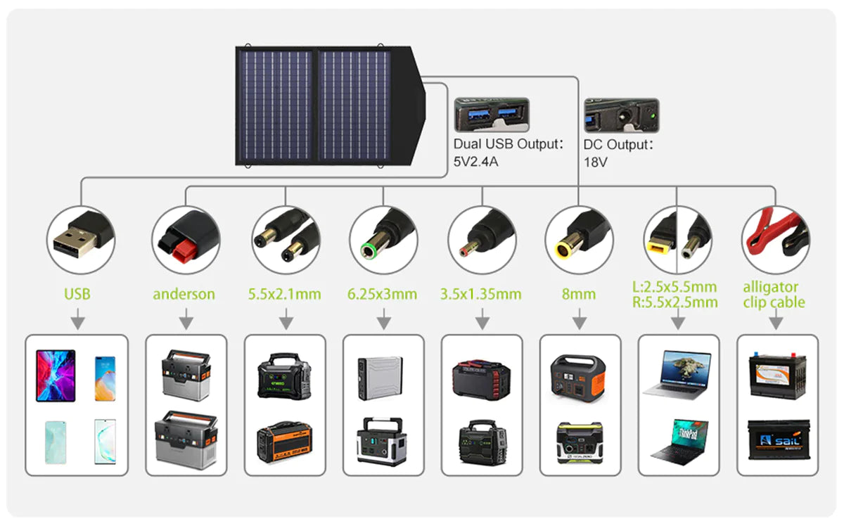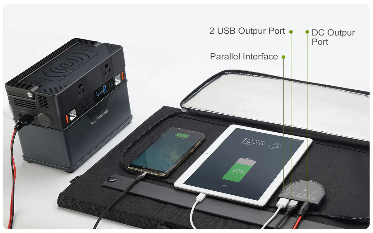 Dotato della doppia uscita USB, il pannello solare da 60 W è altamente compatibile con telefoni, iPad, centrale elettrica portatile ALLPOWERS S200 e altri dispositivi.