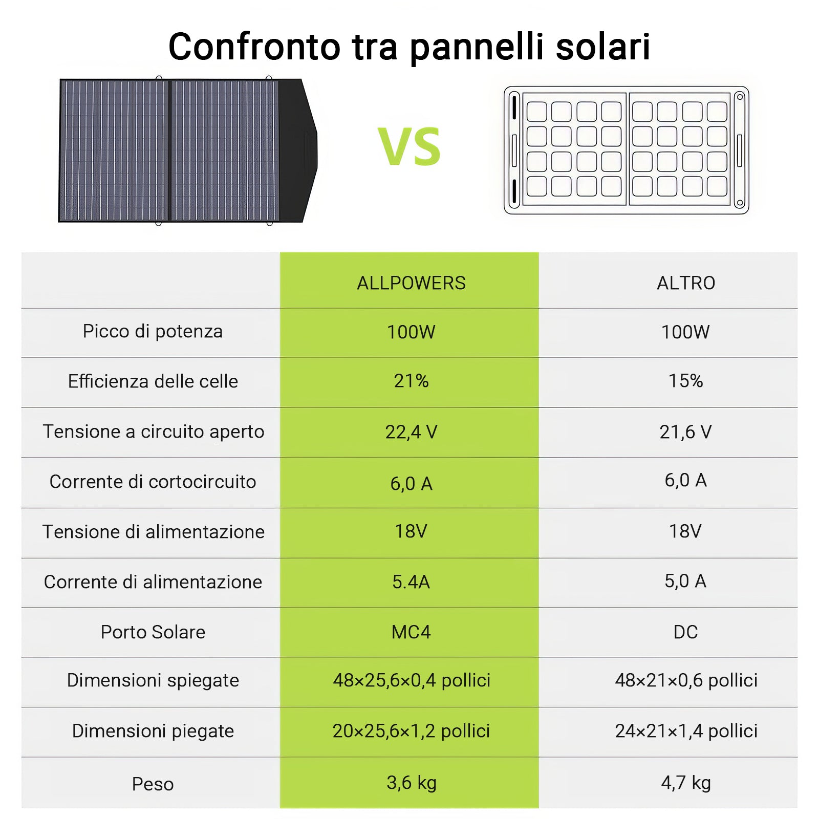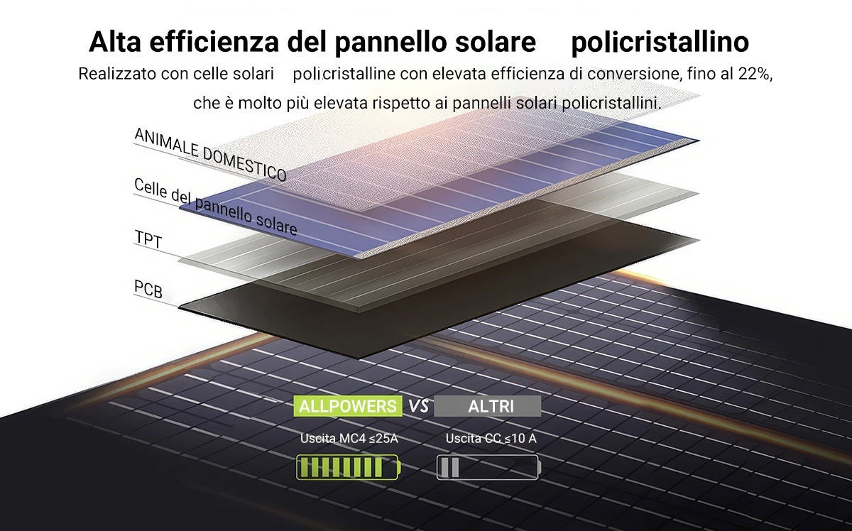 Il kit pannello solare portatile ALLPOWERS da 100 W è prodotto negli Stati Uniti, con un'efficienza fino al 22%, 1/3 più leggero della stessa potenza del silicio solare. La potenza totale è aumentata di 1/3 rispetto alla stessa dimensione del kit di pannelli solari portatili.