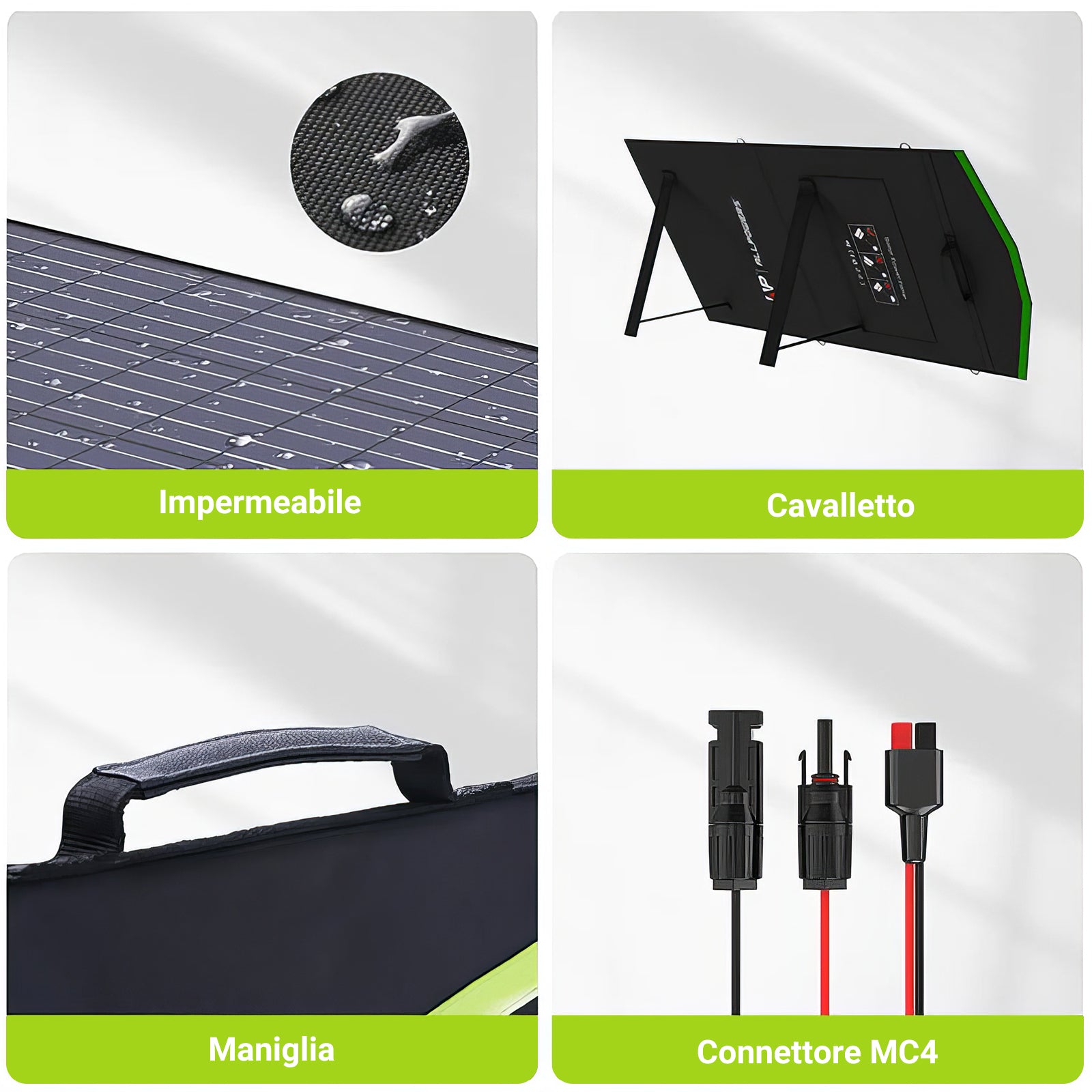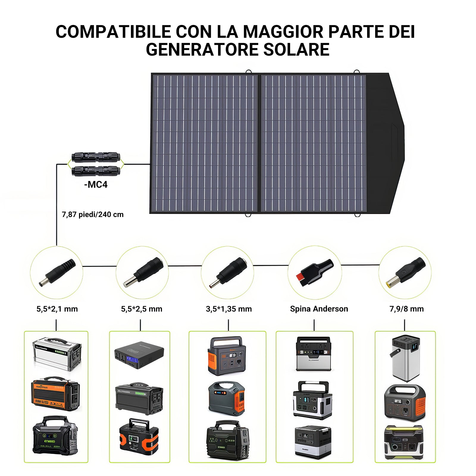 - Compatibile con la maggior parte dei generatori solari con connettori Connettore solare;