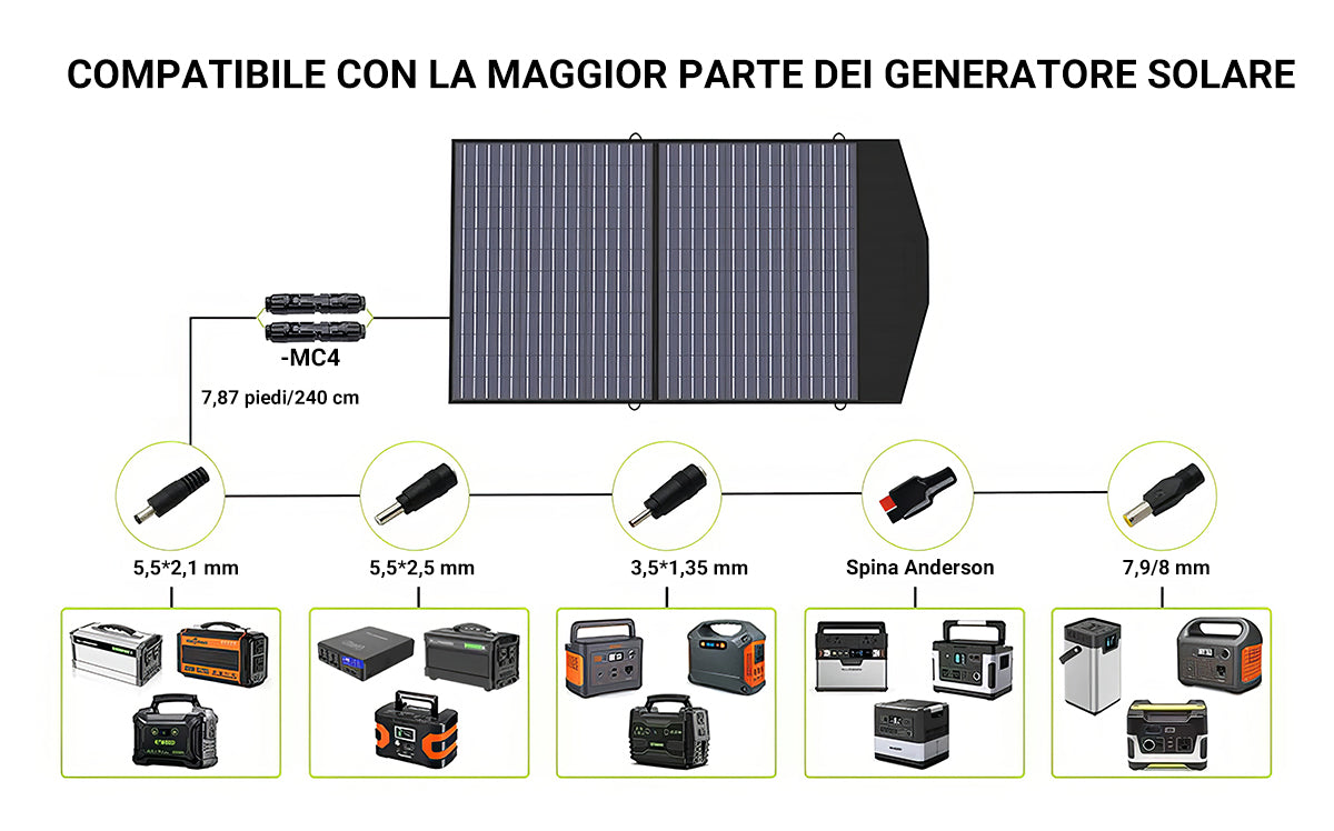 Il pannello solare pieghevole ALLPOWERS da 100 W è compatibile con la maggior parte dei generatori solari/centrali elettriche portatili sul mercato. Il kit pannello solare portatile include connettori di diverse dimensioni per generatore portatile (da Connettore solare ad Anderson / da Connettore solare a DC)