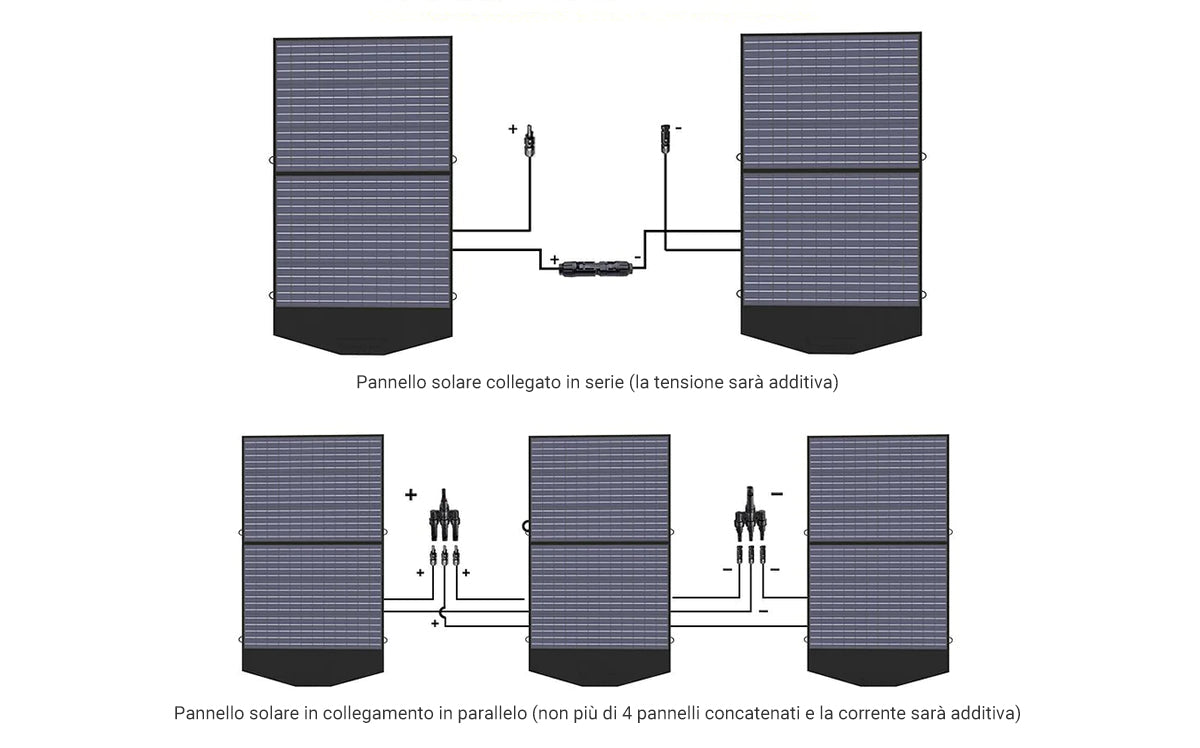 Collegando più pannelli solari in parallelo o in serie, è possibile ottenere potenza e tensione più elevate.