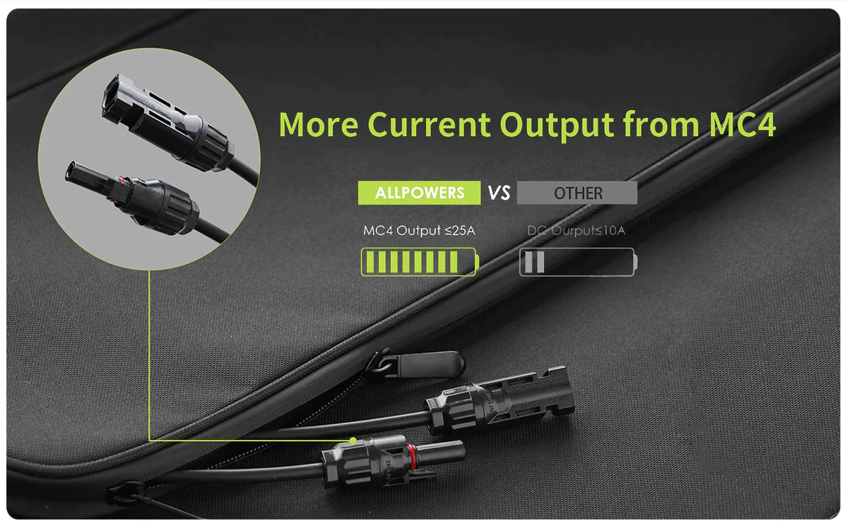 Dimensioni piegate di soli 25,6x20,3x2,4 pollici, 13,9 libbre, il pannello solare portatile da 200 W è ottimo per viaggiare senza elettricità e non occupa molto spazio nella borsa. Il caricabatterie solare pieghevole ALLPOWERS è dotato di uscita Connettore solare (25 A max), che fornisce energia infinita per la centrale elettrica in campeggio, all'aperto, in giardino, camper e roulotte sotto il sole.