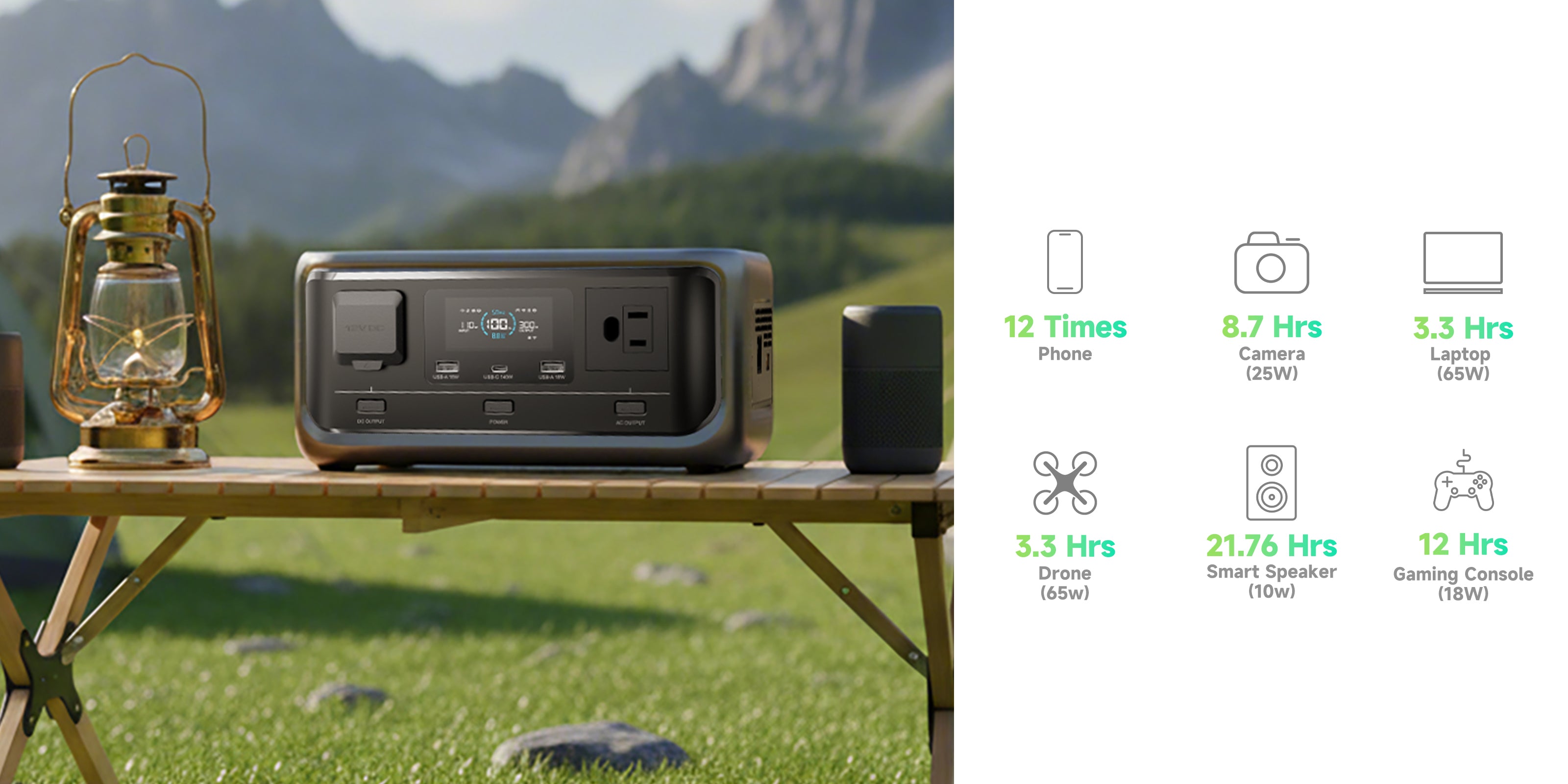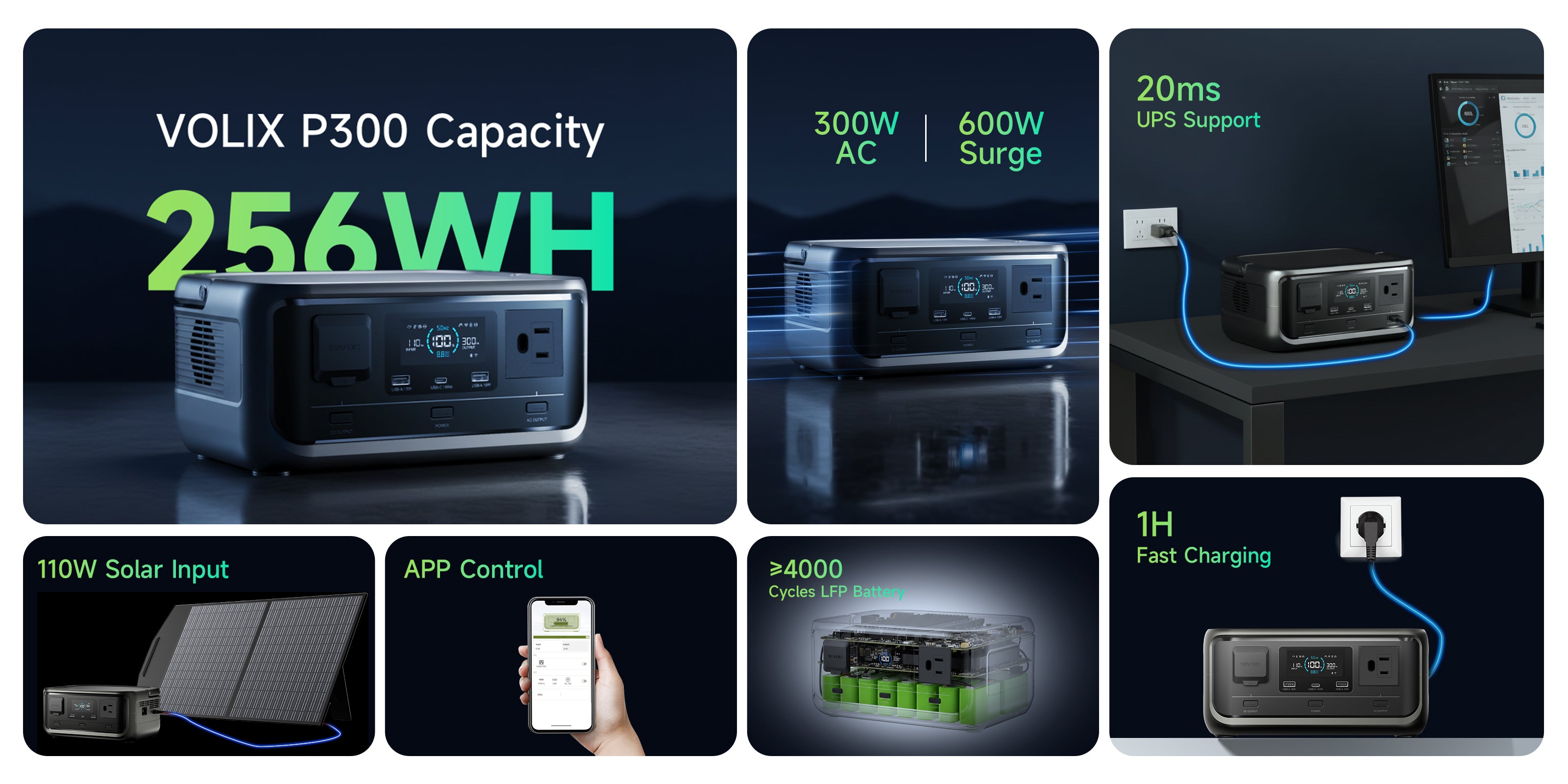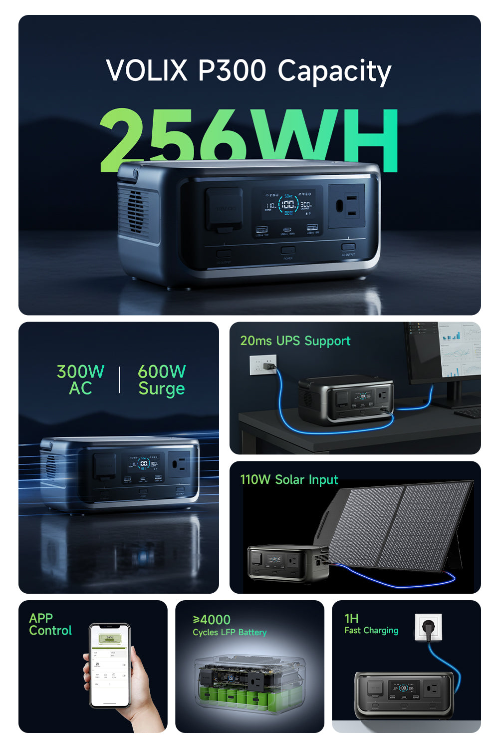 VOLIX P300 Goditi 300W di potenza CA a onda sinusoidale pura e un'enorme capacità di 256Wh. Con 5 uscite versatili, ricarica contemporaneamente il tuo laptop, drone, fotocamera, mini frigorifero e telefono. Ideale per campeggi, emergenze domestiche e spazi di lavoro mobili. La tua soluzione di alimentazione all-in-one.