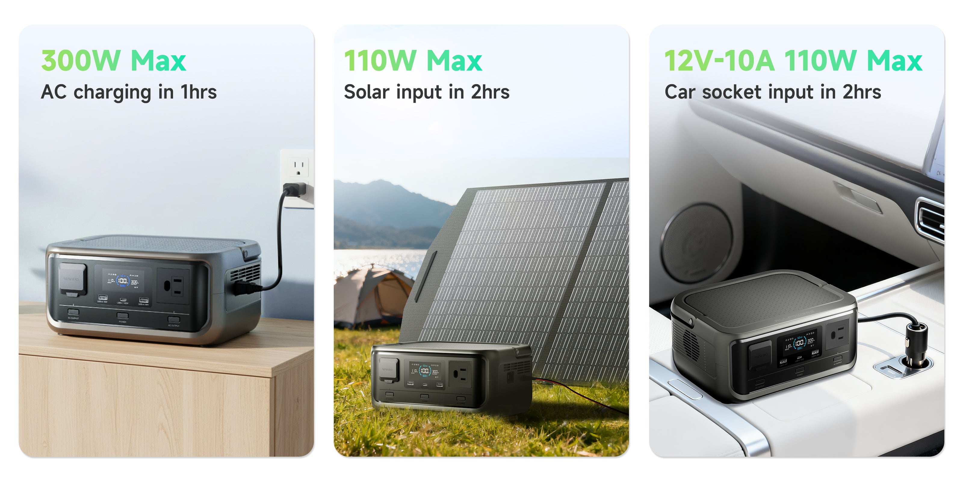 - 4 modalità di ricarica: CA/solare/caricatore accendisigari/CA+solare.