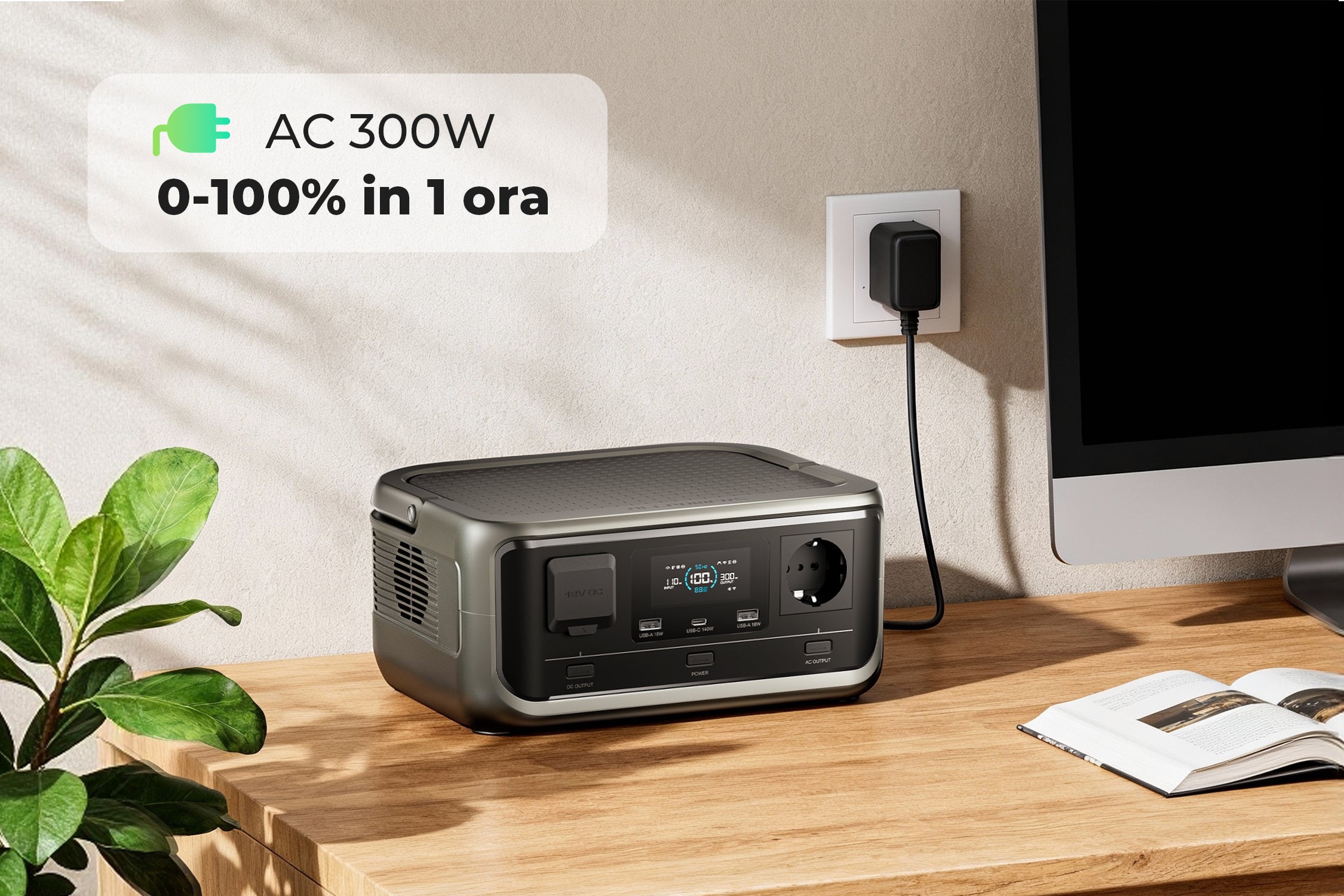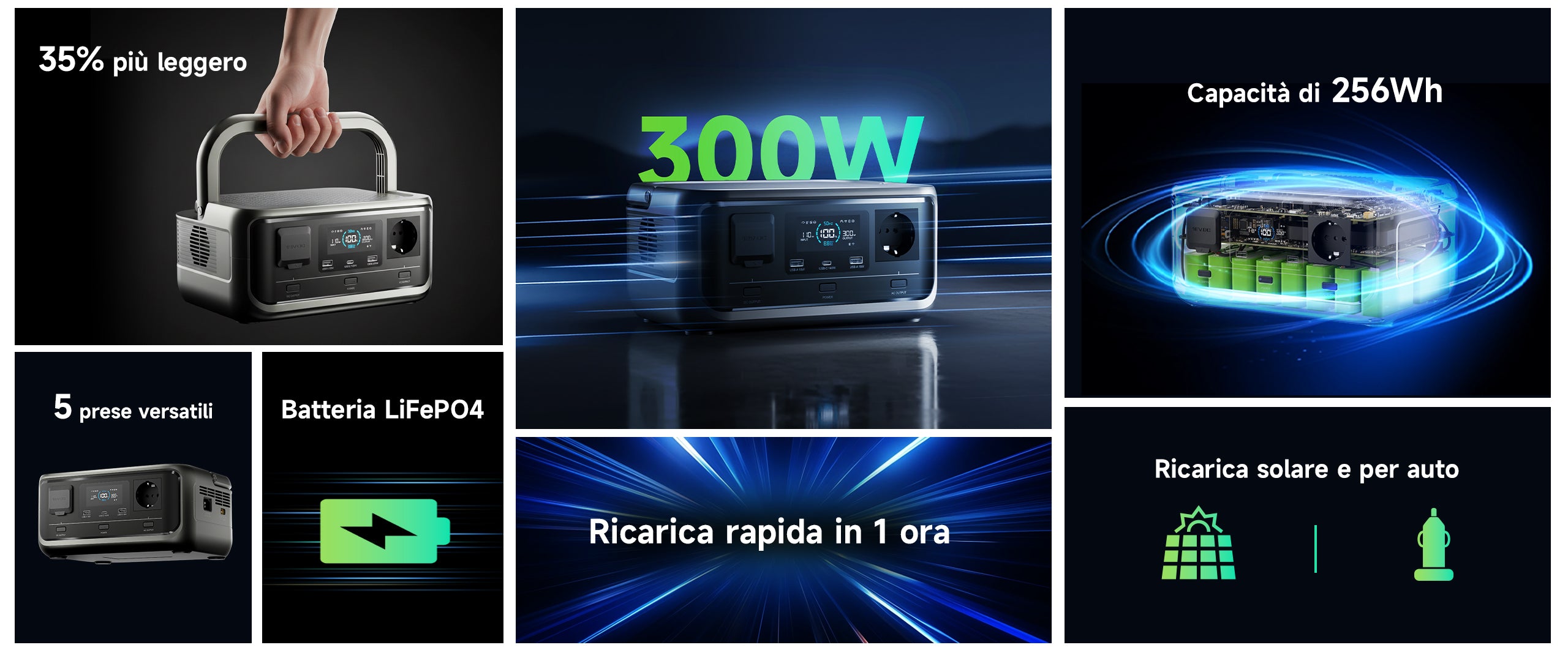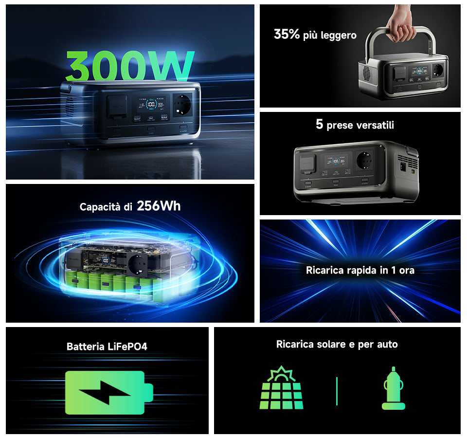 - Ampia capacità e alta potenza: con una capacità di 256Wh e un'uscita CA a onda sinusoidale pura di 300W (600W di picco)