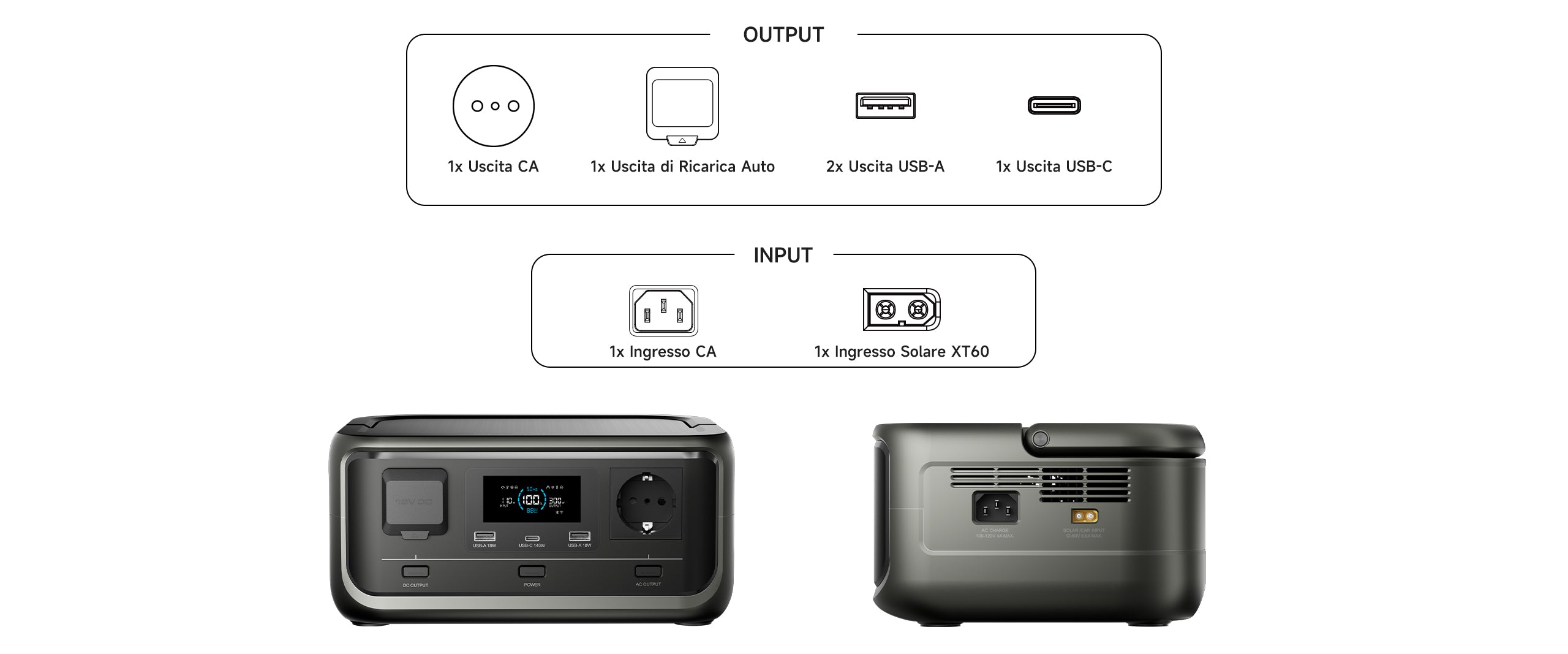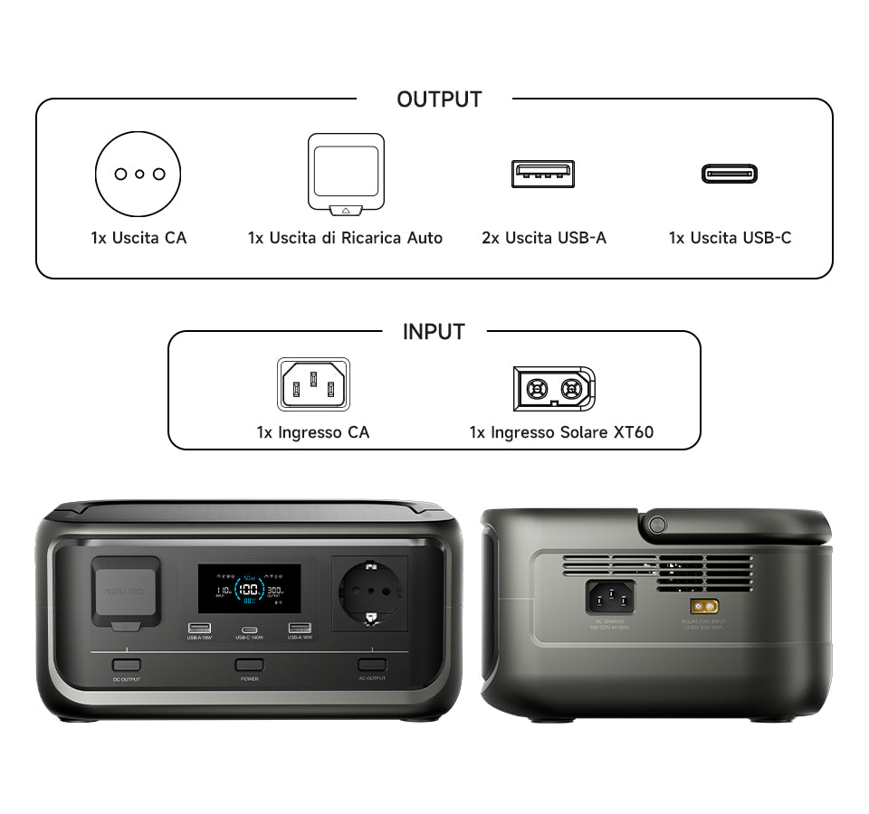 - Nota 1: Il prodotto non include il caricatore per auto né il cavo per il pannello solare. L'acquisto del pacchetto centrale elettrica e pannelli solari include il cavo solare e non include il caricatore per auto.